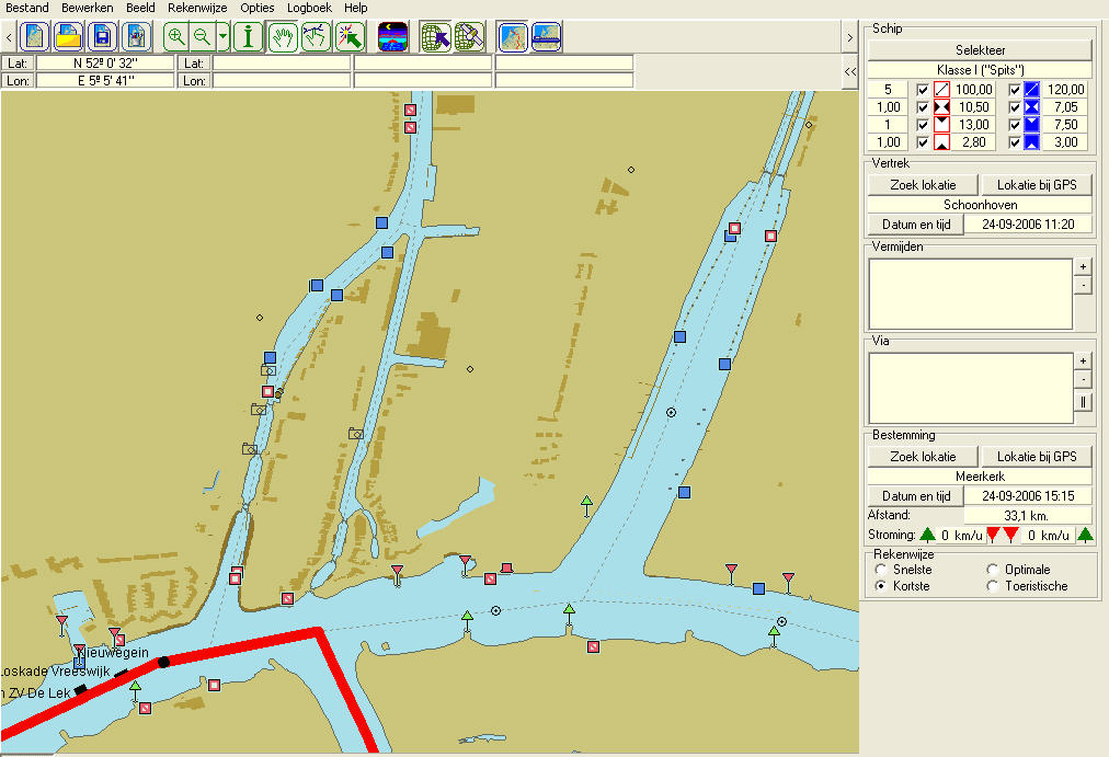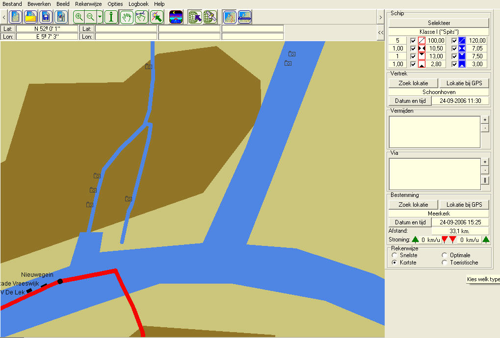Oben ist ein Kartenbild des PC-Navigo im Planungsmodus zu sehen. Auf auf einer Route vom Lek zum Merwedekanal werden zahlreichen Kreuzungen bei Nieuwegein abgebildet. Wie Sie sehen, sind dort weniger oder gar keine Details abgebildet, wenn auch der Flussverlauf im allgemeinen der Wirklichkeit entsprechen dürfte. Mehr Details sind für die Reiseplanfunktion aber auch nicht wirklich nötig: solange das Ergebnis in die Nähe der Wasserstraße kommt, können alle Berechnungen (über die längere Distanz) perfekt erfolgen.